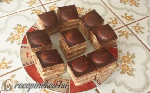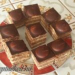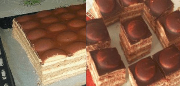 • Aufbau des Desserts: Legen Sie die erste gebackene Teigplatte auf das Blech und bestreichen Sie sie mit 1/3 der Creme. Fahren Sie mit den weiteren Platten und der Creme auf dieselbe Weise fort. Am Ende sollten Sie mit der Creme abschließen. Belegen Sie die Oberseite des Desserts nach Geschmack mit Kinderbiskuits.