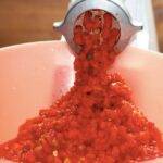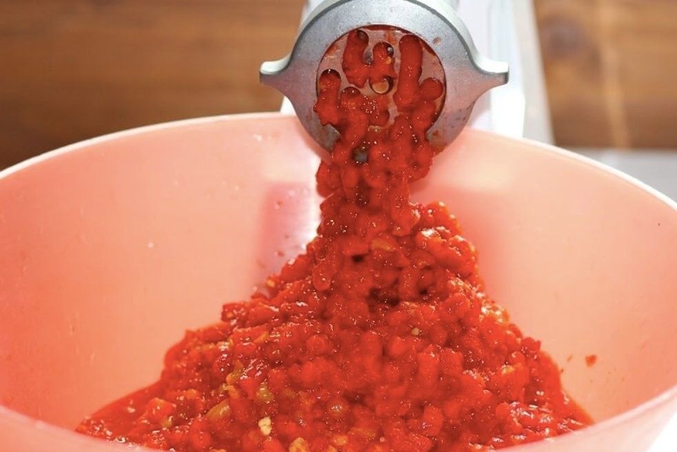 - Pressen Sie Tomaten, Paprika und Apfel durch den Fleischwolf