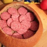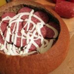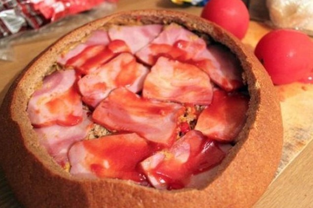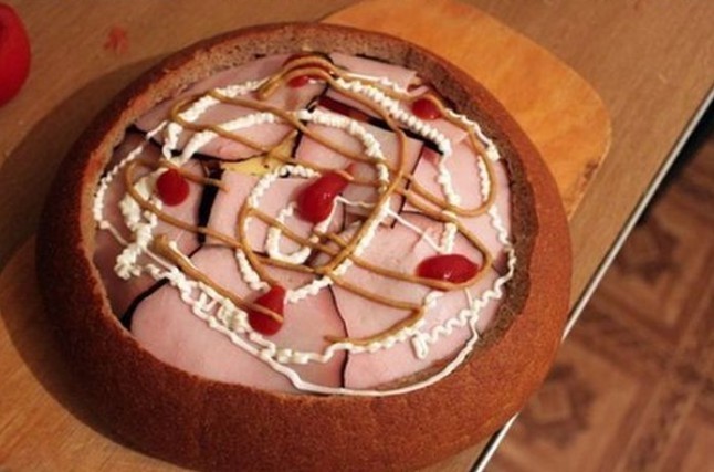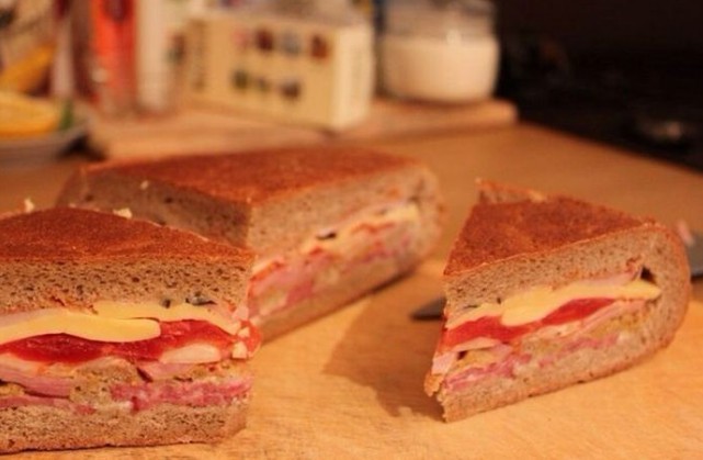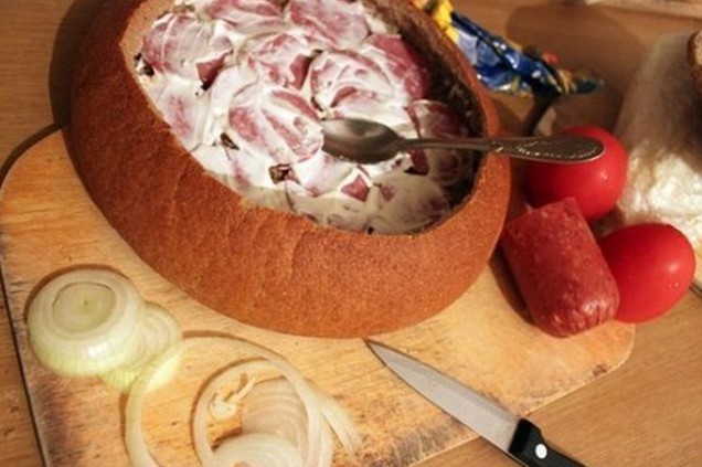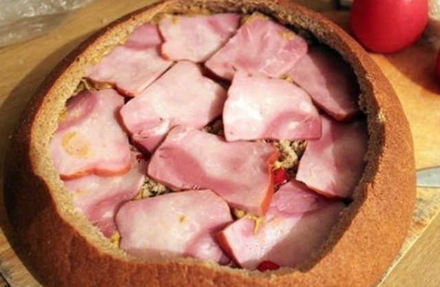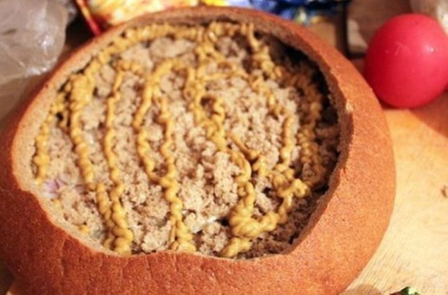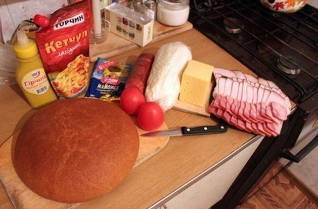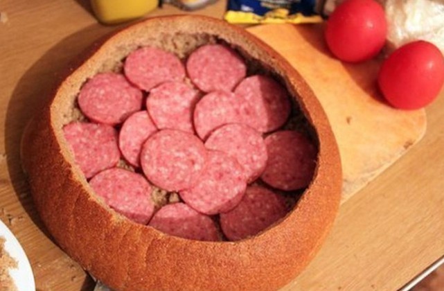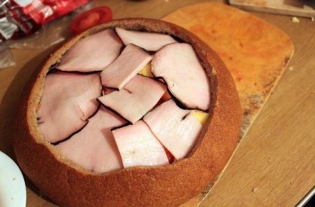 - Auf den Boden des Brotes legen wir Salamischeiben, bestreichen ihn mit Schmelzkäse, belegen ihn mit in Scheiben geschnittener Zwiebel, schichten die Hälfte des ausgehöhlten Brotinneren darauf, bestreichen ihn mit Senf, belegen ihn mit klein geschnittenem Chili, mit Scheiben von Speck oder geräuchertem Schinken, schichten das Brot wieder auf, geben Senf, in Scheiben geschnittene Tomaten, Hartkäse, Speck oder geräucherten Schinken darauf, bestreichen diesen mit Ketchup, belegen ihn mit Chinakohl und Schinken und bestreichen alles mit Schmelzkäse, Ketchup und Senf.