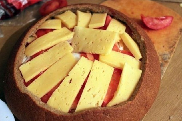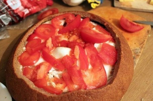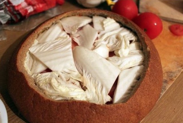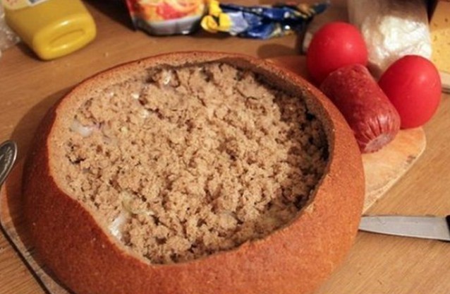 - Wir schneiden die Oberseite des Brotes ab, höhlen das Innere mit den Händen aus und legen es beiseite.
