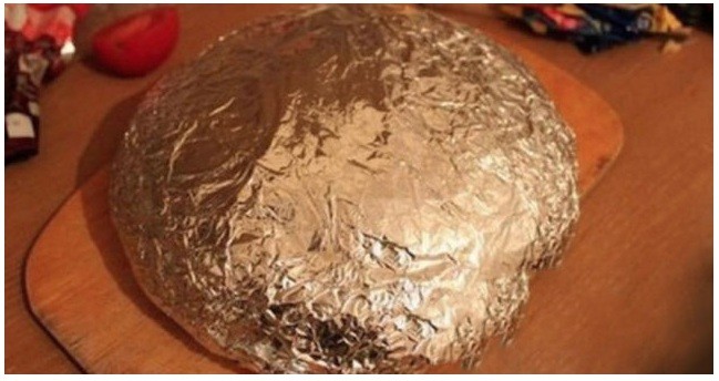 - Wir decken das mit dem abgeschnittenen Brotstück ab und wickeln das Ganze in Alufolie. Fest zusammendrücken.