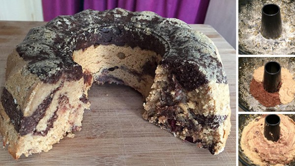 - 4. Vorbereitung der Form: Die Gugelhupfform (Durchmesser ca. 23 cm) mit Kokosöl einfetten und mit zerkleinerten Haferflocken ausstreuen. Abwechselnd beide Teige einschichten. Wenn Sie Nüsse, Cranberries, Mandeln oder andere Zutaten hinzufügen möchten, rühren Sie diese kurz vor dem Schichten hinein.