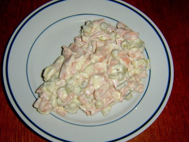 - 1. Vorbereitung der Zutaten: Schneiden Sie zuerst die Pariser Salami und die Gurken in dünne Streifen. Die Zwiebel in kleine Würfel schneiden und um ihre Bitterkeit zu entfernen, mit kochendem Wasser übergießen. Geben Sie die geschnittenen Zutaten in eine Schüssel und fügen Sie die sterilisierten Erbsen hinzu.