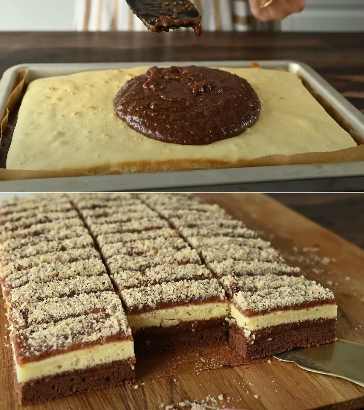 • Aufbau des Kuchens: Die untere Kakaoschicht mit der Hälfte der Creme bestreichen, die helle Schicht darauflegen und mit der restlichen Creme bestreichen. Die Oberfläche mit gehackten Nüssen bestreuen und 2–3 Stunden im Kühlschrank fest werden lassen.