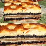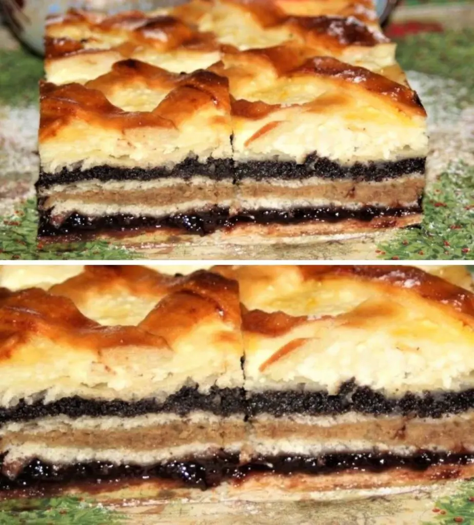 • Schichten von Teig und Füllungen Den aufgegangenen Teig in 5 gleich große Teile teilen. Jeden Teil auf die Größe des Backblechs (30 × 40 cm) ausrollen. Das gefettete Backblech mit dem ersten Teigblatt belegen und mit der Powidl-Füllung bestreichen. Mit dem zweiten Teigblatt abdecken, leicht andrücken und mit der Nussfüllung bestreichen. Das dritte Blatt auflegen und die Mohnfüllung verstreichen. Auf das vierte Blatt die Quarkfüllung geben und glatt streichen. Aus dem fünften Blatt Streifen schneiden und ein Gitter formen. Mit dem verquirlten Ei bestreichen.