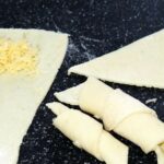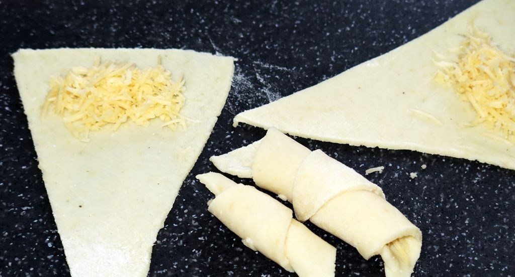 - Diesen schneiden wir anschließend in gleichmäßige Dreiecke, ähnlich wie eine Pizza. Auf das Ende jedes Stücks streuen wir etwas geriebenen Hartkäse. Die Scheibe Kartoffelteigs rollen wir dann auf.