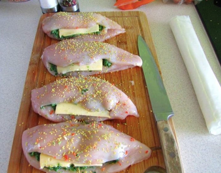 - Wir schneiden jede Brust so ein, dass eine Tasche entsteht. Jede Tasche füllen wir mit der Spinatfüllung. Oben auf die Füllung geben Sie Käse.