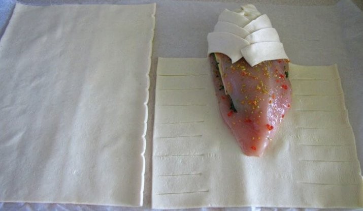 - Wickeln Sie jede Brust in den vorbereiteten Blätterteigmantel und fixieren Sie ihn, indem Sie die Streifen verbinden.