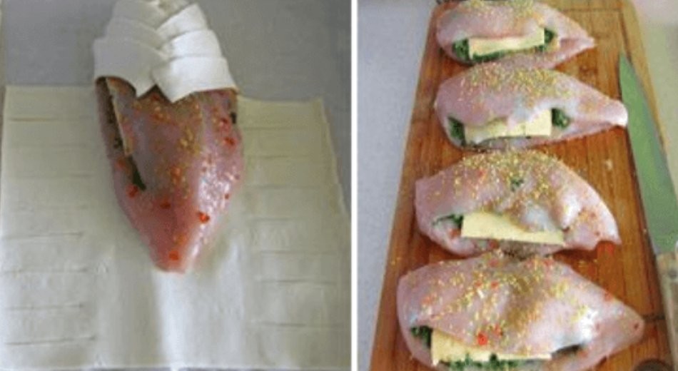 - Wickeln Sie jede Brust in den vorbereiteten Blätterteigmantel und fixieren Sie ihn, indem Sie die Streifen verbinden.