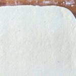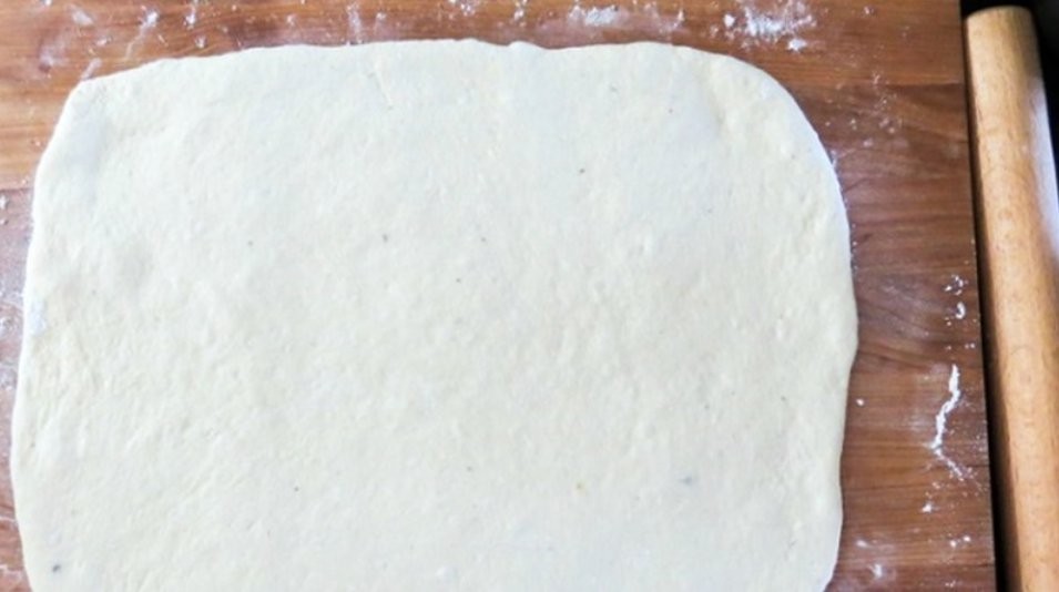 - Dann rollen Sie aus dem Teig auf einer gut bemehlten Arbeitsfläche ein Rechteck aus.