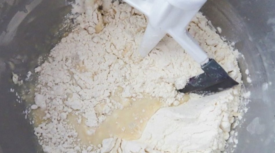 - Geben Sie 150 g Mehl zu dieser Mischung und rühren Sie gut um, damit keine Klumpen entstehen.