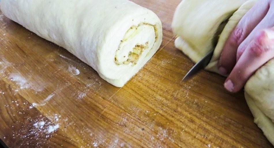 - Rollen Sie den Teig auf und schneiden Sie ihn in etwa 8 Stücke.