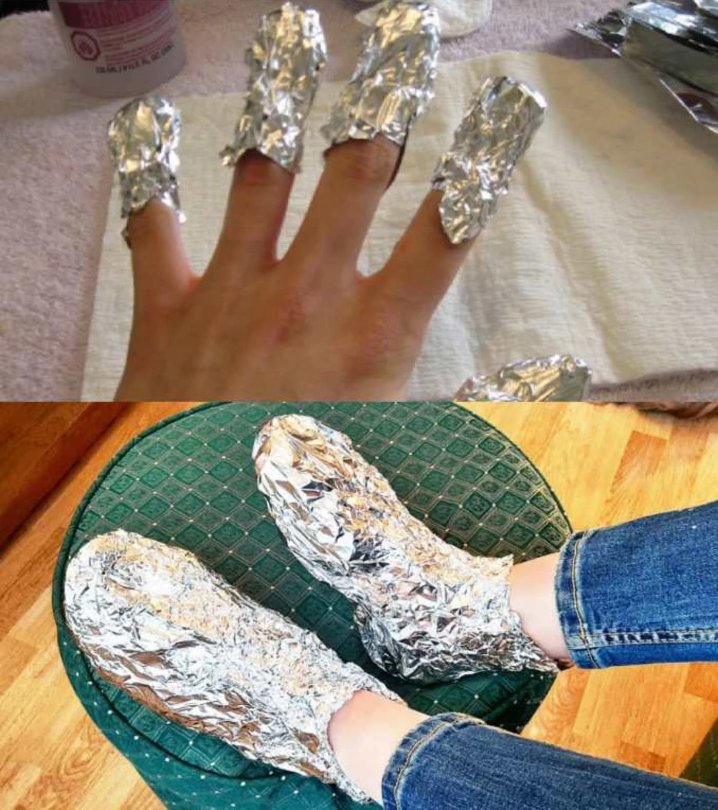 So geht’s: Wickeln Sie die Füße in 5–7 Lagen Alufolie. Legen Sie zwischen die einzelnen Lagen Papier oder Baumwollstoff. Lassen Sie es etwa eine Stunde einwirken, nehmen Sie dann die Folie ab. Nach zwei Stunden wiederholen Sie den Vorgang mit neuer Folie. Dieser Ablauf wird empfohlen, drei Tage hintereinander durchzuführen.