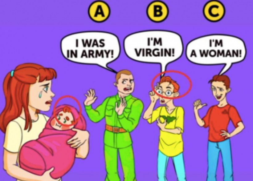 Er versucht, sich eine verdächtige Lüge über Jungfräulichkeit auszudenken, doch seine Haare, die genauso sind wie die des Kindes, verraten ihn.