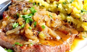 Bäuerlicher Nackenbraten, gebacken mit Zwiebeln und Bier – ein duftendes Mittagessen aus dem Ofen