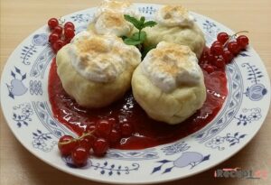 Rezept für die guten alten süßen Knödel, gefüllt mit Johannisbeeren und serviert mit Johannisbeersauce.