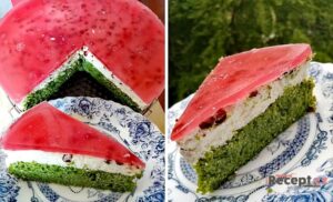 Luxuriöser Sommerkuchen, der wie eine Wassermelone aussieht. Er erfreut Kinder, aber auch Erwachsene.