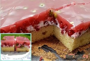 Kuchen mit Stachelbeeren und Johannisbeeren mit Sahnecreme und Pudding-Gelee.
