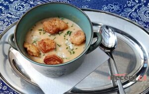 Polévka "co dům dal" s parmazánovými krutony. -> Suppe "was das Haus hergab" mit Parmesan-Croutons.