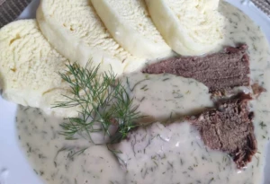 Herzhafte Dillsoße aus Rinderbrühe mit Hefeknödel