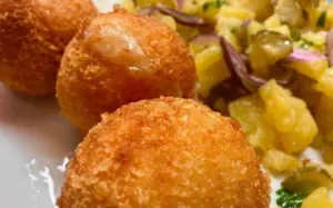 Hermelín-Kugeln mit Schinken und Kartoffelsalat ohne Mayonnaise