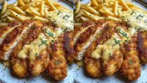 Knusprige Hähnchenschnitzel mit Knoblauch-Käse-Sauce und butterigen Nudeln