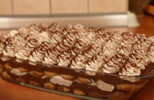 Schokoladenkuchen mit Löffelbiskuits im Stil von Tiramisu. Wenn Sie ihn einmal probiert haben, werden Sie nie wieder gewöhnliches Tiramisu wollen!