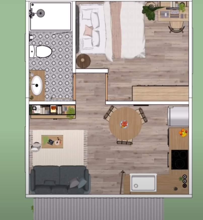 Obwohl die Fläche nur 30 m2 beträgt, wird es Ihnen ausreichend geräumig und voller cleverer Ideen erscheinen.