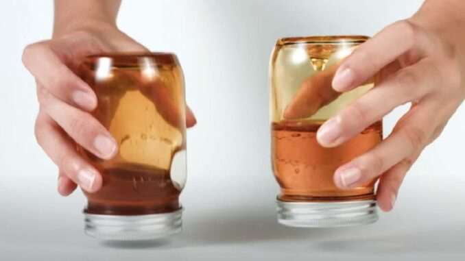Gefäßtest: Drehen Sie das Honiggefäß auf den Kopf. Gefälschter Honig läuft schnell heraus, während echter Honig langsam an den Wänden des Gefäßes hinabläuft und einen dünnen Strahl bildet, der sich nur langsam senkt.