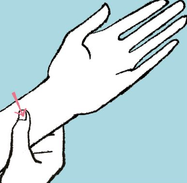 Legen Sie den Ringfinger auf die Mitte der inneren Handgelenksfalte. Dieser Punkt befindet sich ungefähr drei Fingerbreit von dieser Falte in Richtung Ellenbogen. Wenn Sie ihn gefunden haben, drücken Sie ihn sanft mit dem Finger.